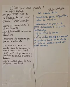 La première pratique consistait à susciter une approche phénoménologique de nos pieds, autrement dit, décrire l’expérience telle qu’elle apparaît à la conscience : c’est la première fois que vous avez des pieds, décrivez moi les sensations !